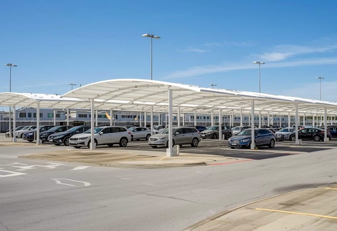 Ensure maximum vehicle safety and passenger comfort with specialized airport parking shade structures. Engineered as a high-durability shade structure, these systems often incorporate an airport tensile structure to provide essential overhead protection for long-term and short-term parking lots. A professionally installed airport canopy shields thousands of vehicles from intense solar heat and environmental debris, turning a vast, exposed parking area into a premium, weather-protected facility.