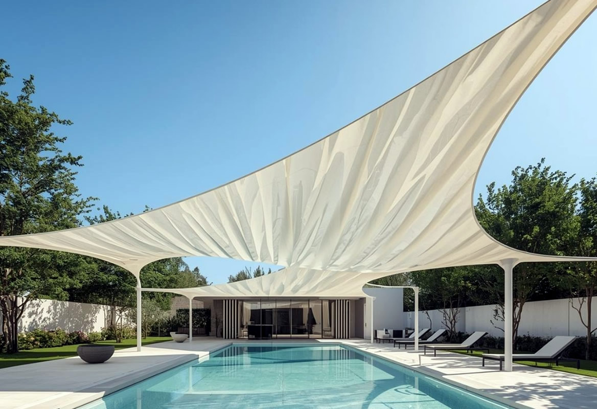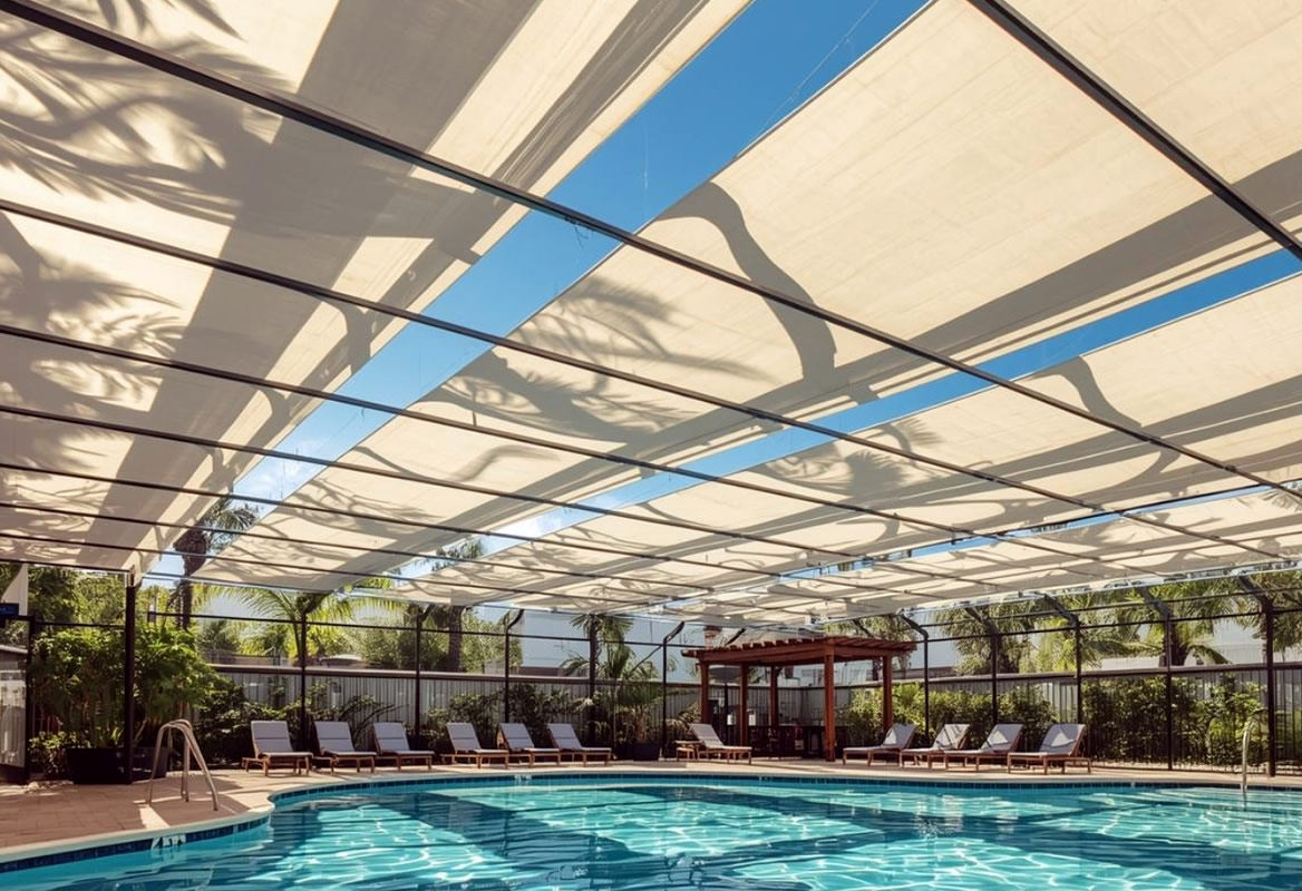 Pool canopy structures offering controlled sunlight, reduced heat gain, and year-round usability.